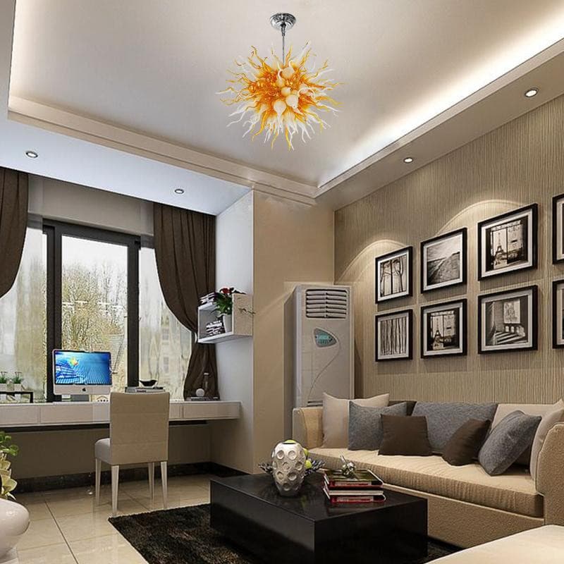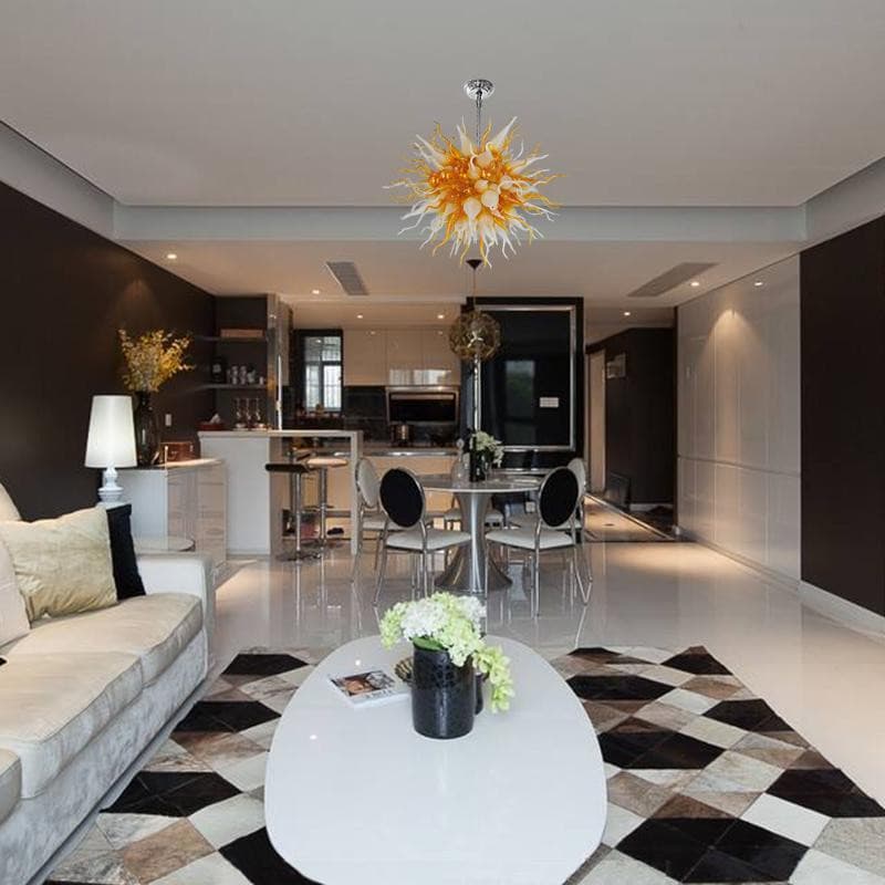 This blown glass chandelier is a work of art that combines beauty and practicality. The overall shape is spherical, composed of many slender glass tubes and round glass bulbs head. These elements radiate outward from the center, resembling a blooming flower or a brilliant firework, and are very dynamic. The main colors are white and golden. The combination of the two colors creates a warm and soft atmosphere with both contrast and harmony. It can be matched with modern style living room, dining room, bedroom, etc. Also suitable for art galleries, hotels, restaurants and other public places.