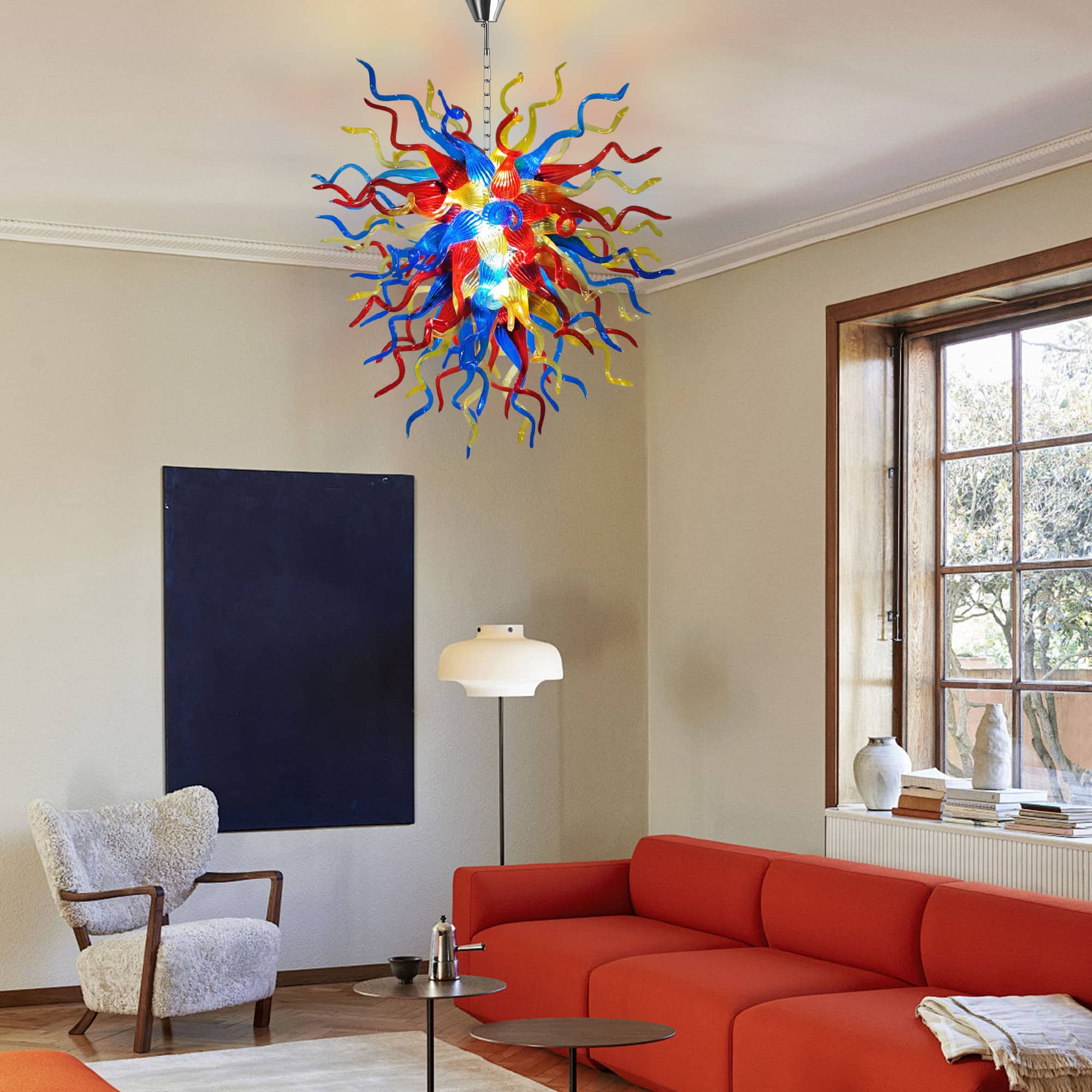 Illuminate your space with this vibrant blown glass chandelier, designed with striking red, yellow, and blue hand-blown spirals that bring energy and movement into any room. Inspired by the iconic Chihuly-style art glass aesthetic, this statement piece is ideal for anyone looking to add a bold, joyful, and artistic focal point to their interior.