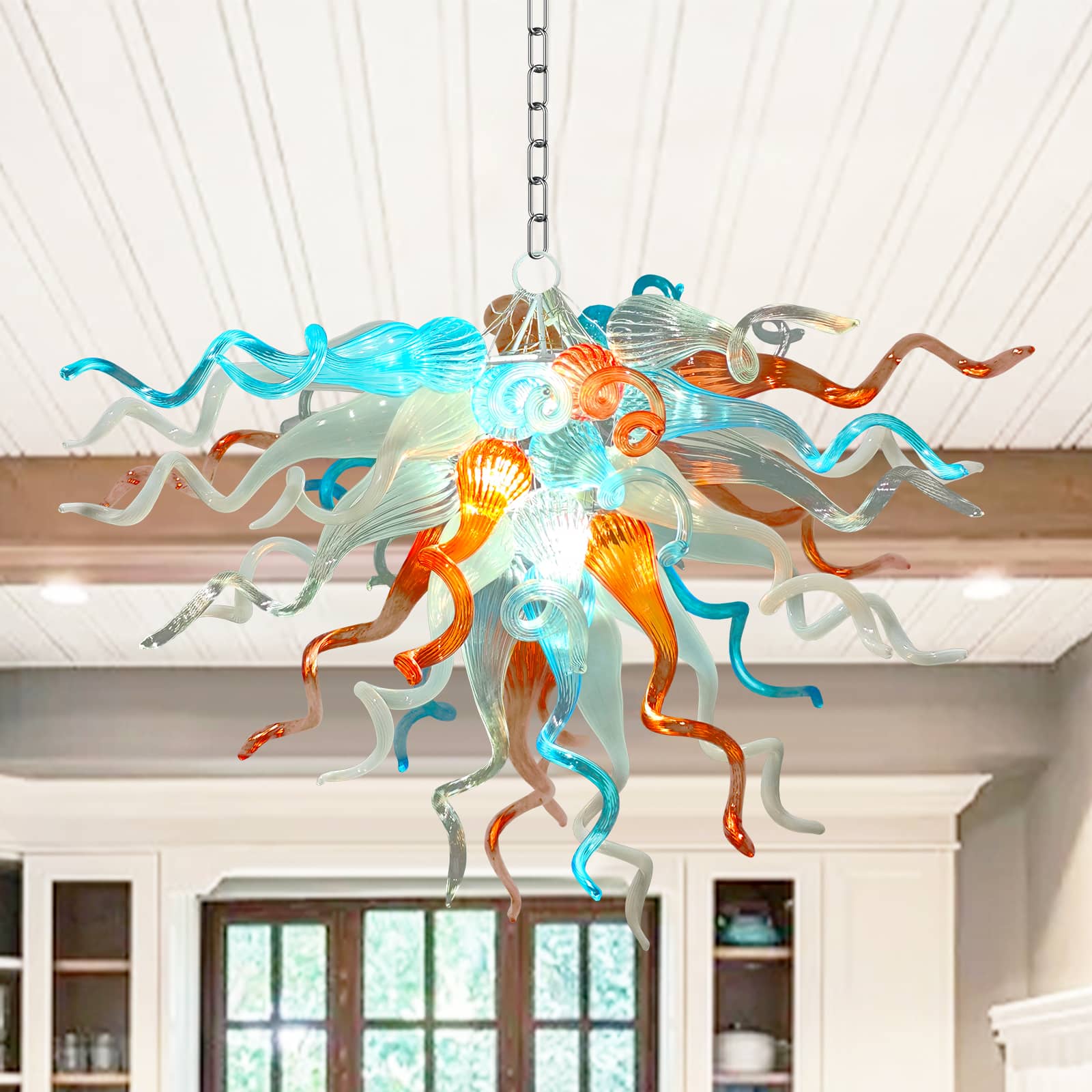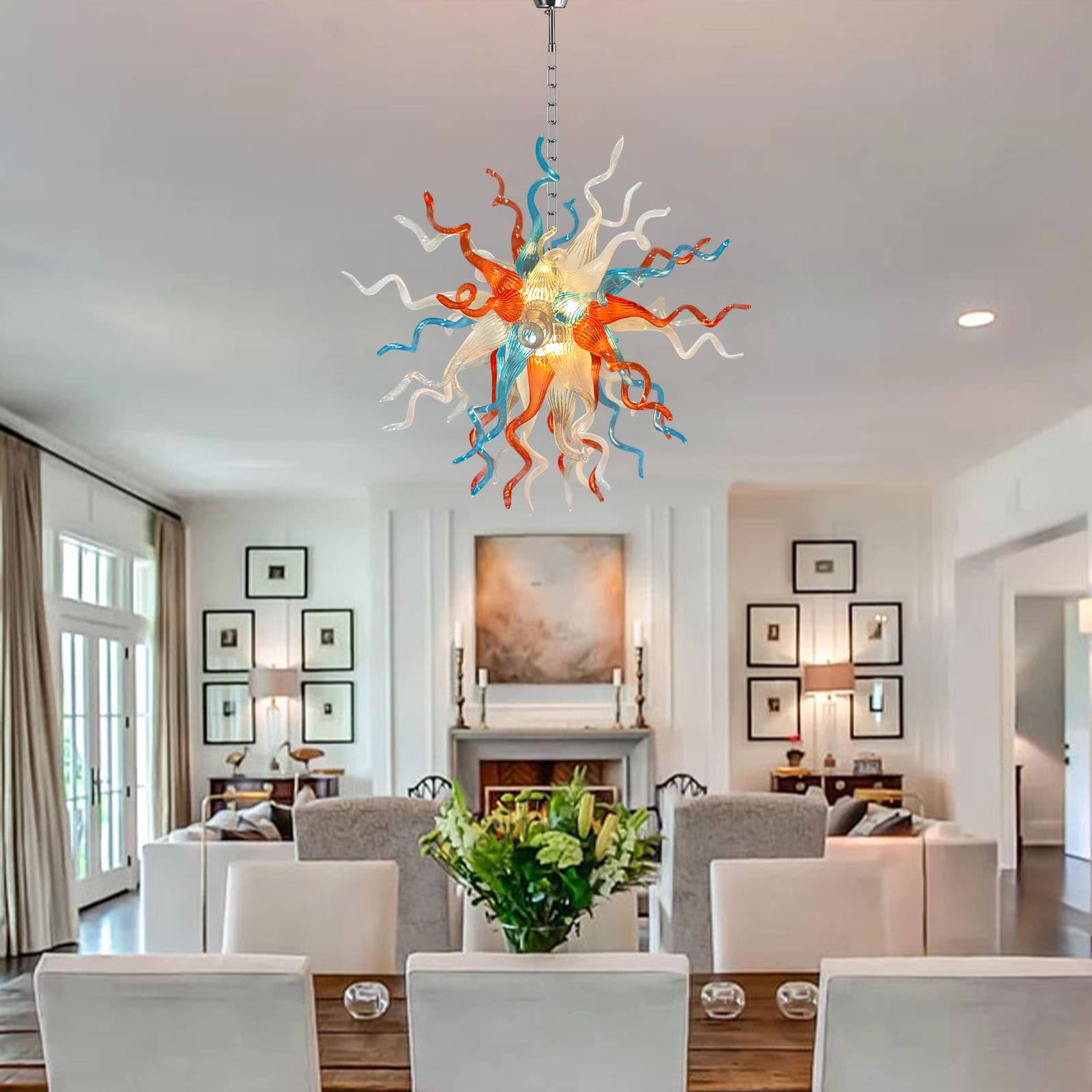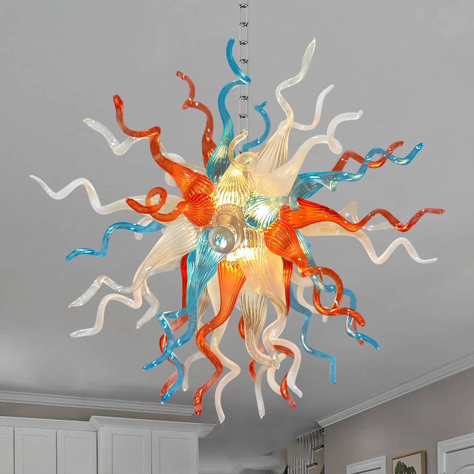 Featuring a striking palette of aqua blue, sunset orange, soft white, and crystal-clear glass, this chandelier evokes the organic grace of blooming coral or a radiant celestial burst. Perfect for dining rooms, entryways, and creative spaces, it transforms any interior into an inspiring visual masterpiece.