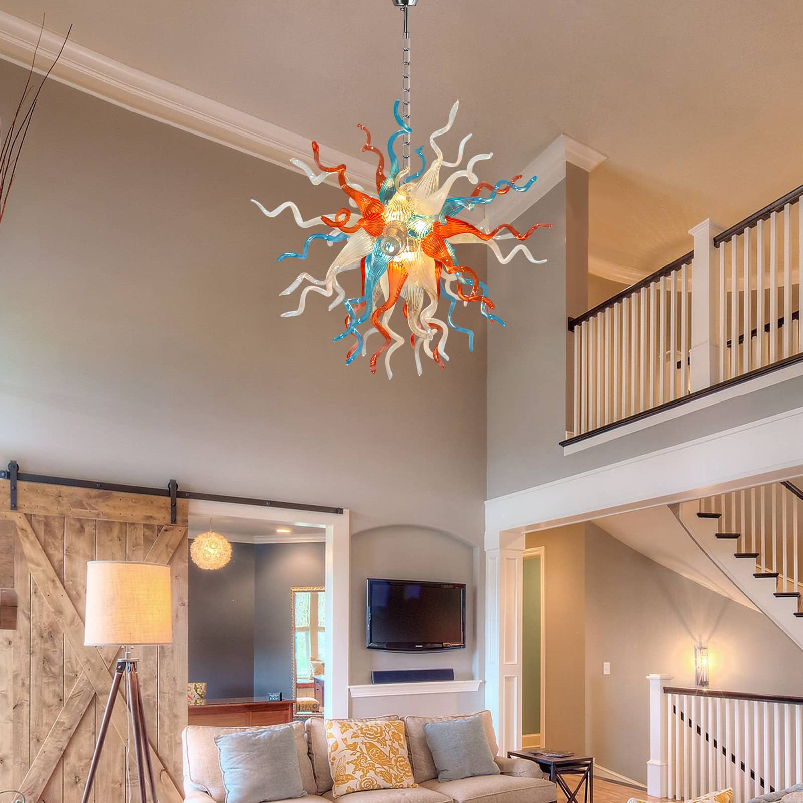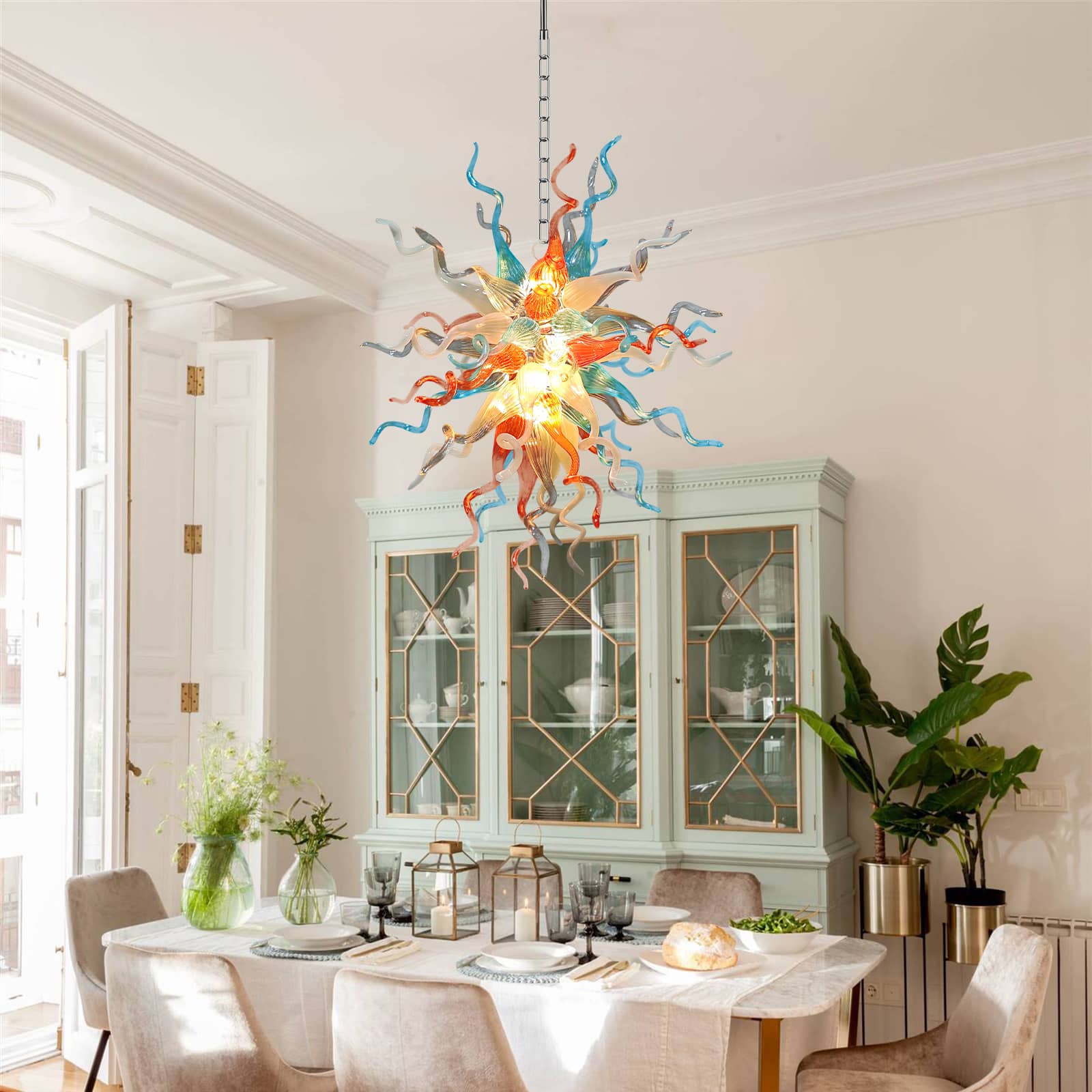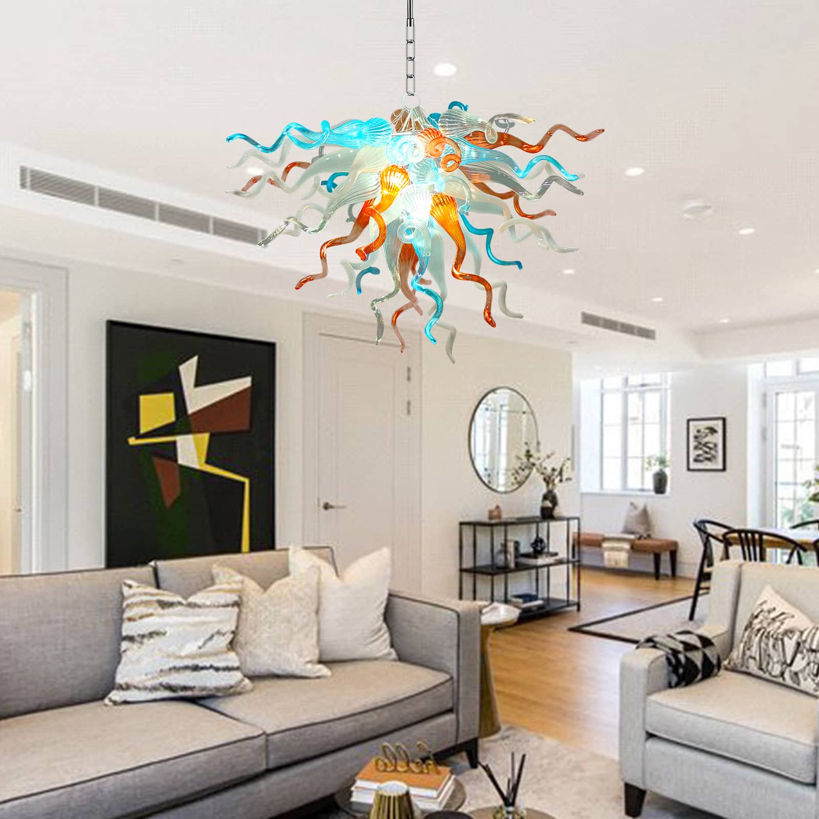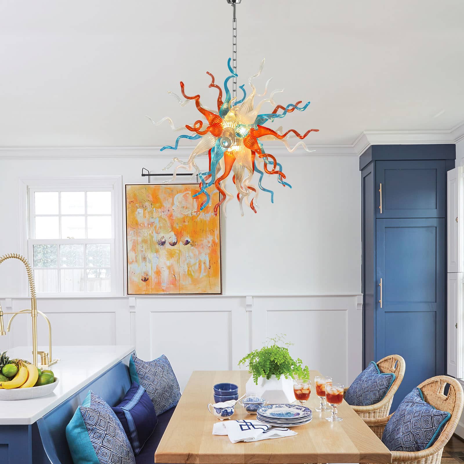Featuring a striking palette of aqua blue, sunset orange, soft white, and crystal-clear glass, this chandelier evokes the organic grace of blooming coral or a radiant celestial burst. Perfect for dining rooms, entryways, and creative spaces, it transforms any interior into an inspiring visual masterpiece.