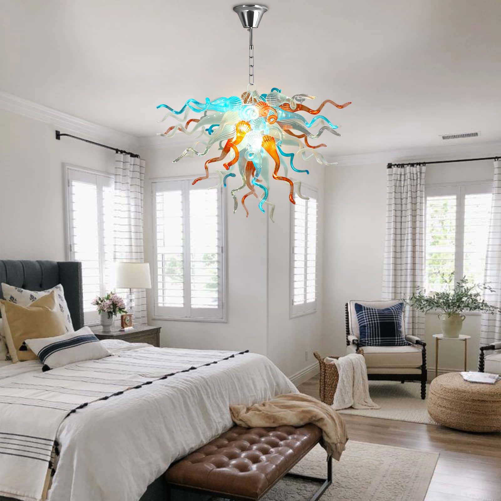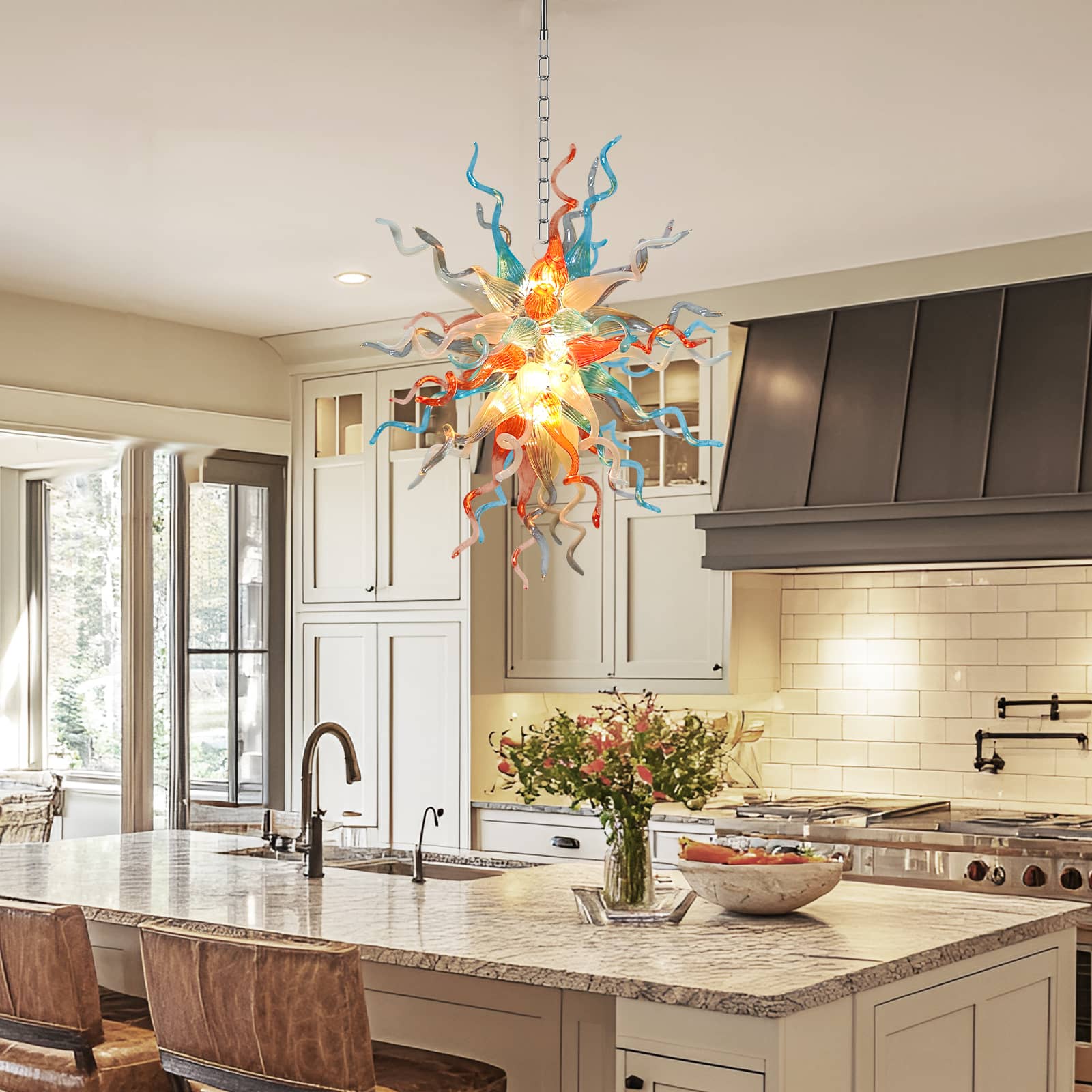 Infuse your home with vibrant artistry through this exquisite Multi colors hand blown glass Chihuly style chandelier, inspired by the expressive beauty of Chihuly-style design. Each swirling tendril and sculpted glass form captures movement, color, and creativity—turning light into a living work of art.