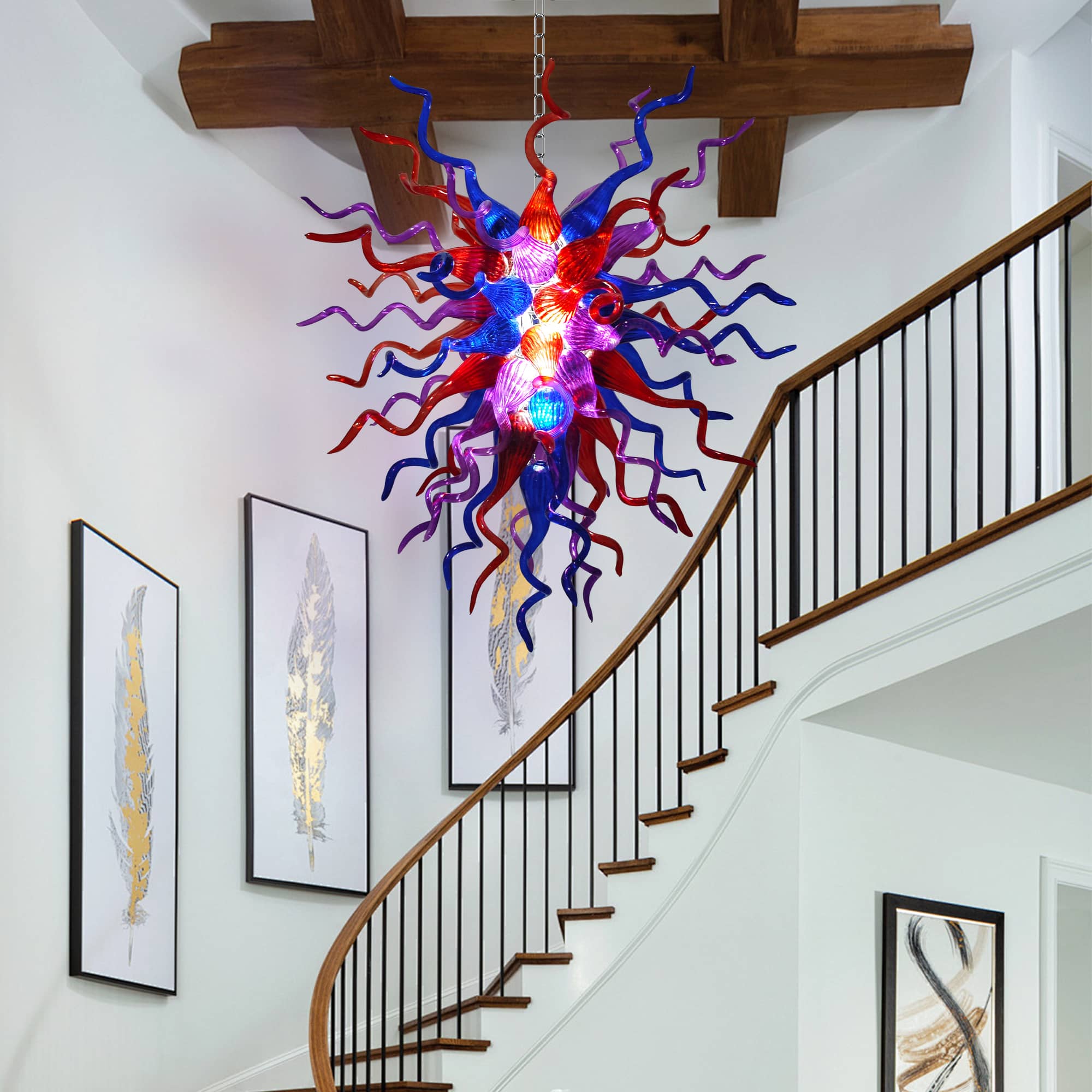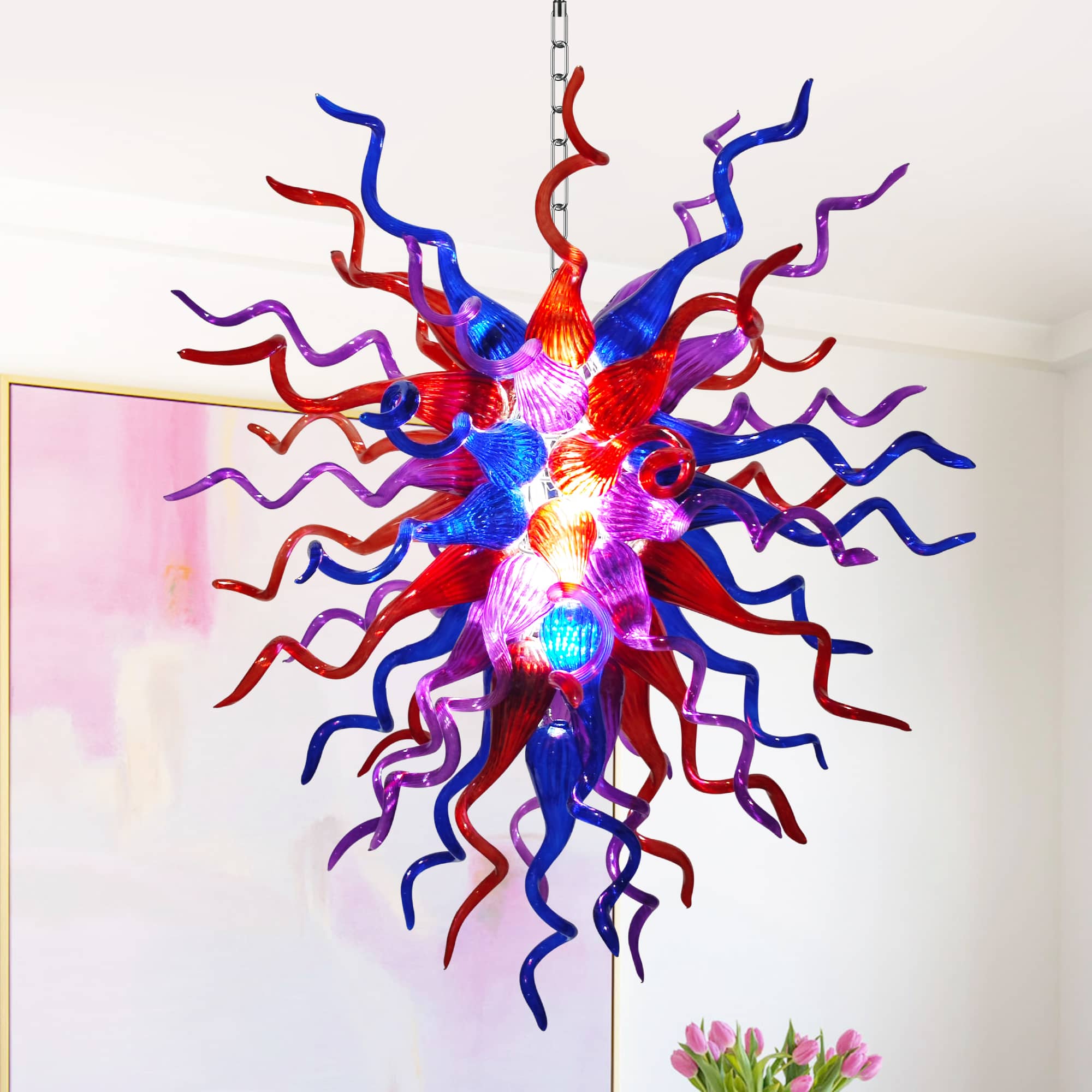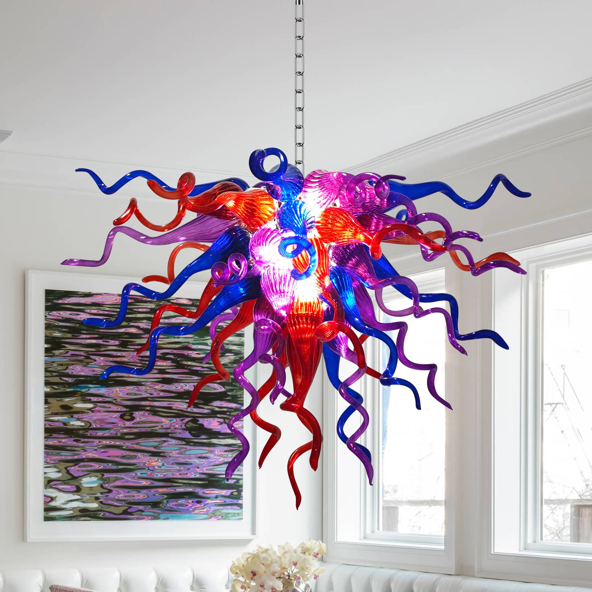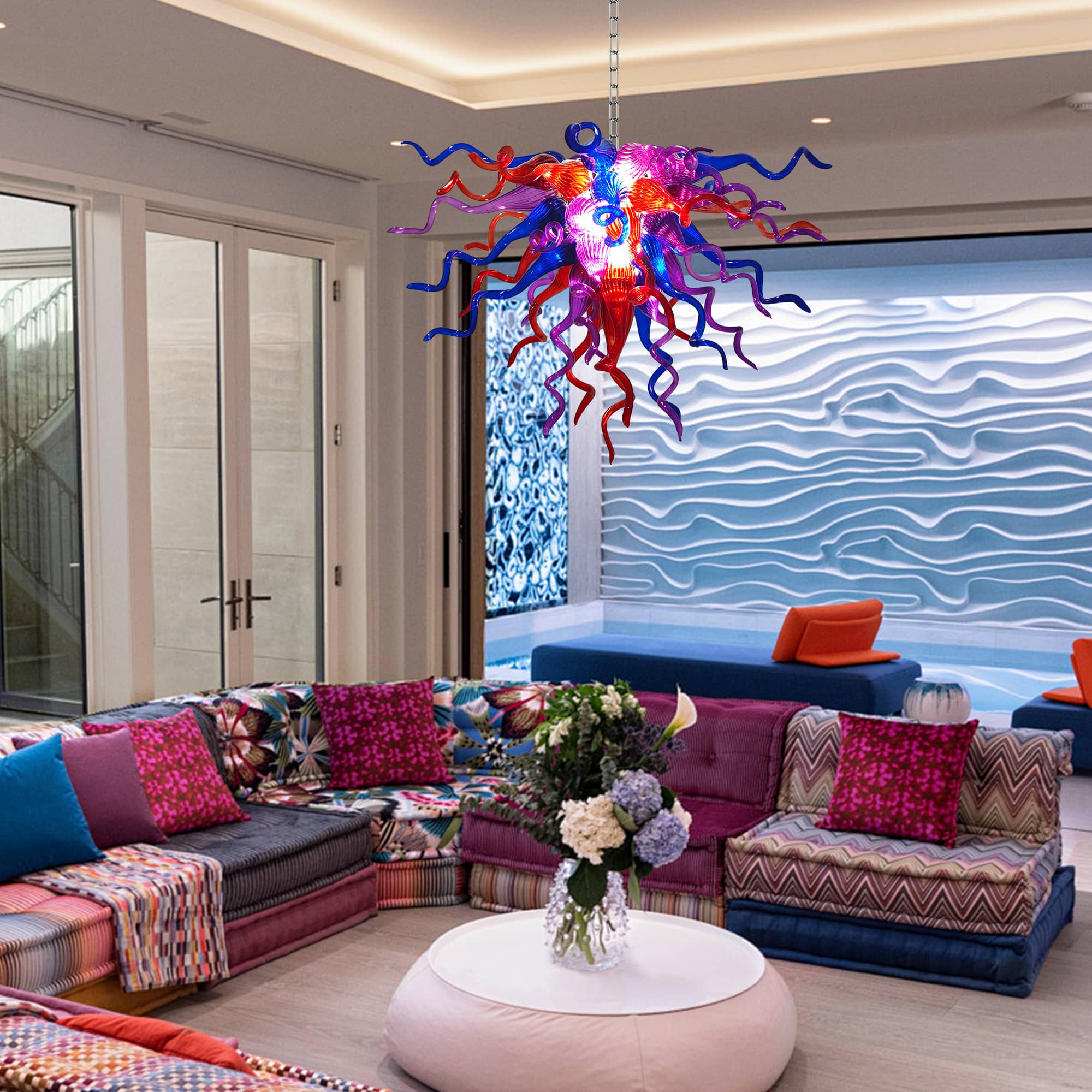 Perfect for grand living rooms, statement dining areas, double-height ceilings, stairwells, or luxury interiors, this Chihuly-inspired glass chandelier is more than a lighting fixture—it is a conversation piece and a work of art. Each piece is truly one of a kind, making your space uniquely yours.