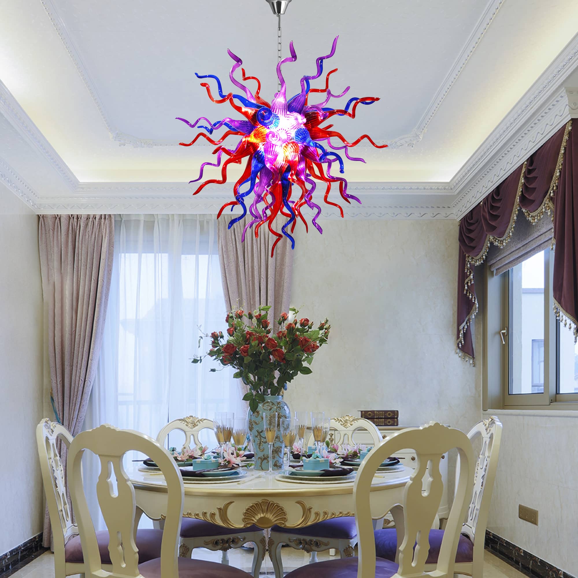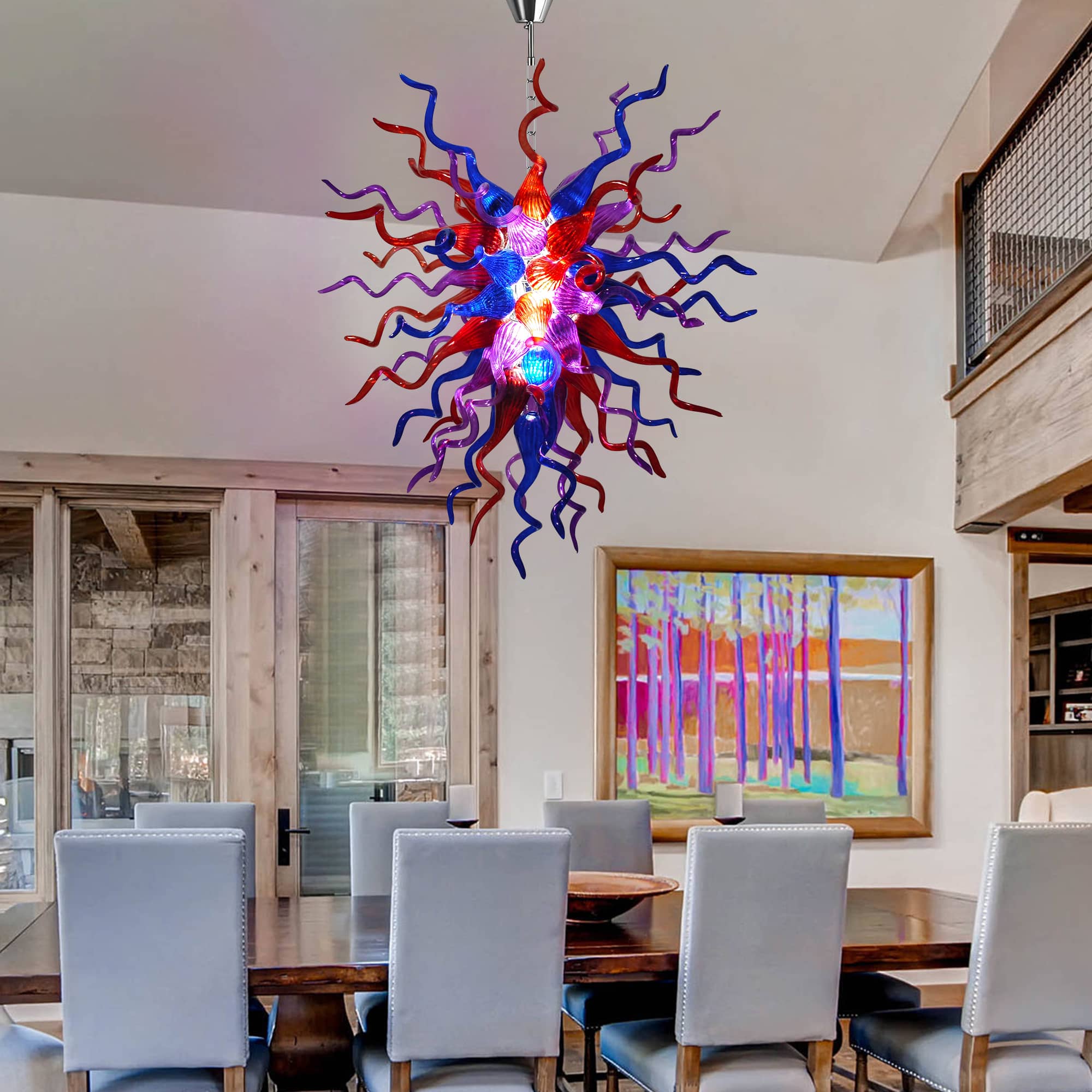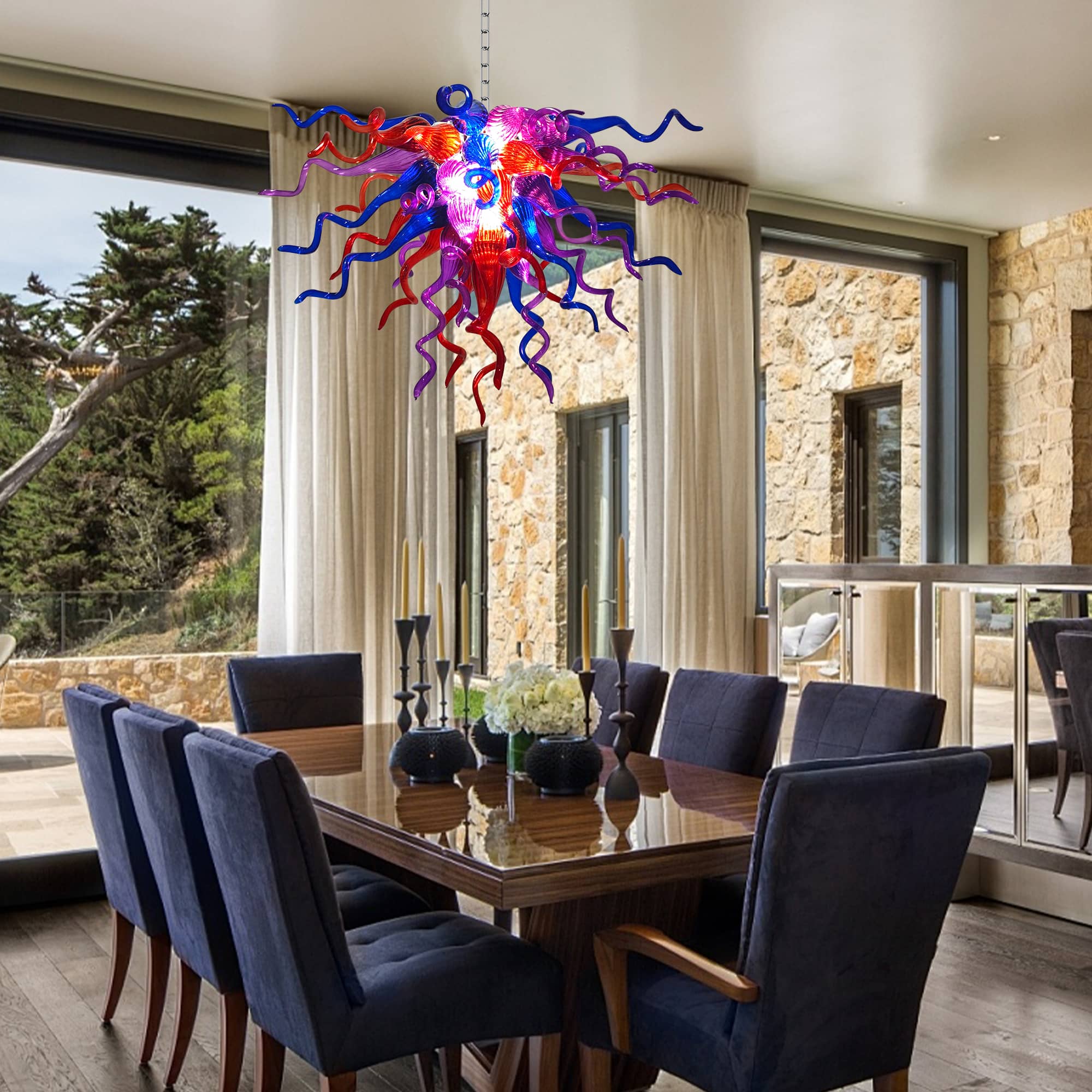 Perfect for grand living rooms, statement dining areas, double-height ceilings, stairwells, or luxury interiors, this Chihuly-inspired glass chandelier is more than a lighting fixture—it is a conversation piece and a work of art. Each piece is truly one of a kind, making your space uniquely yours.