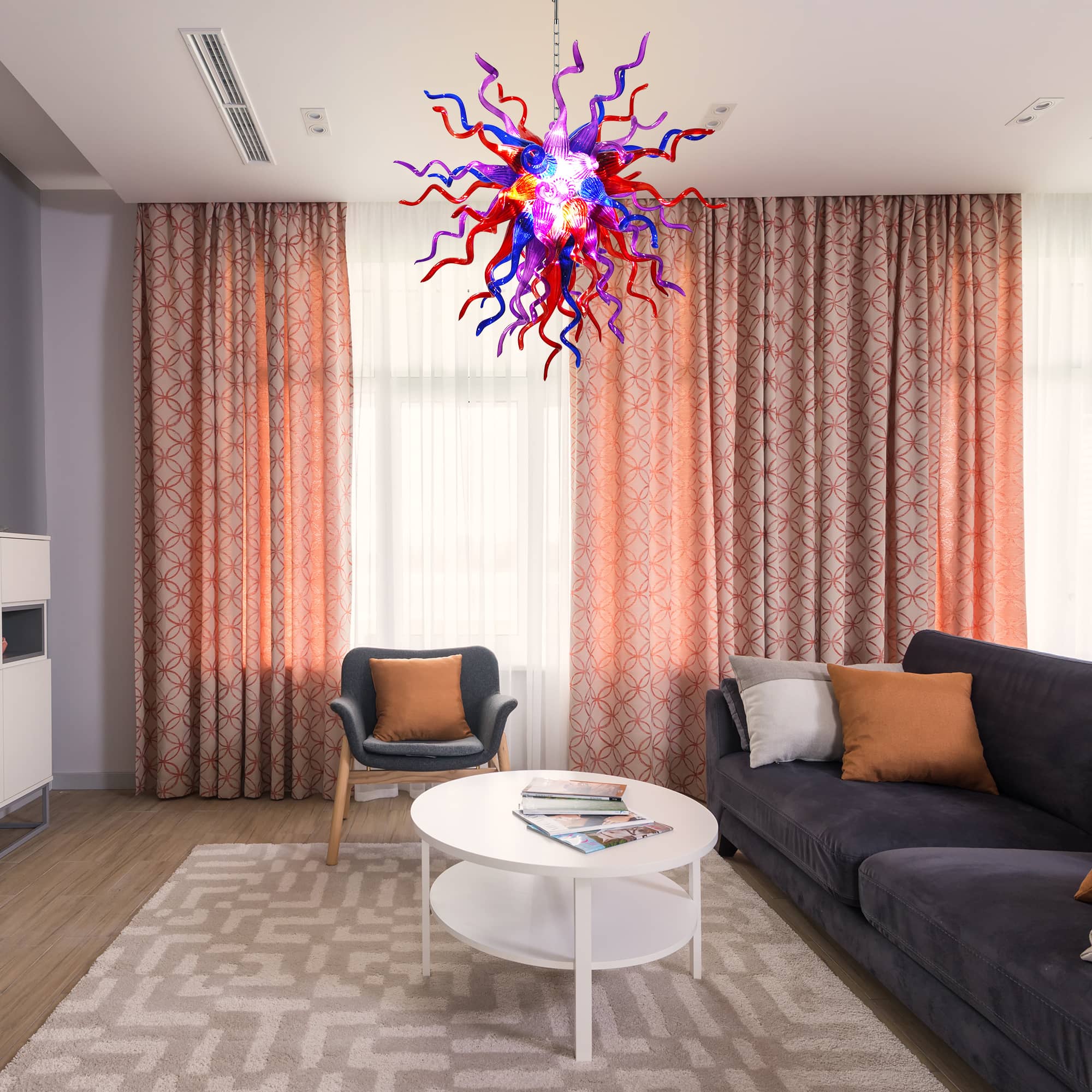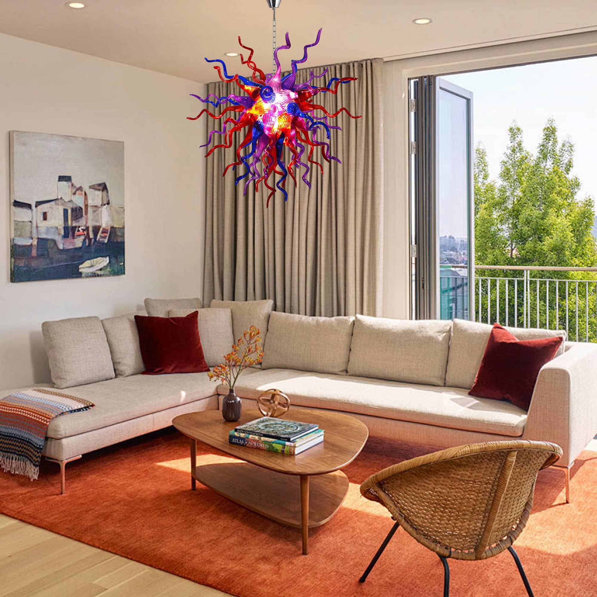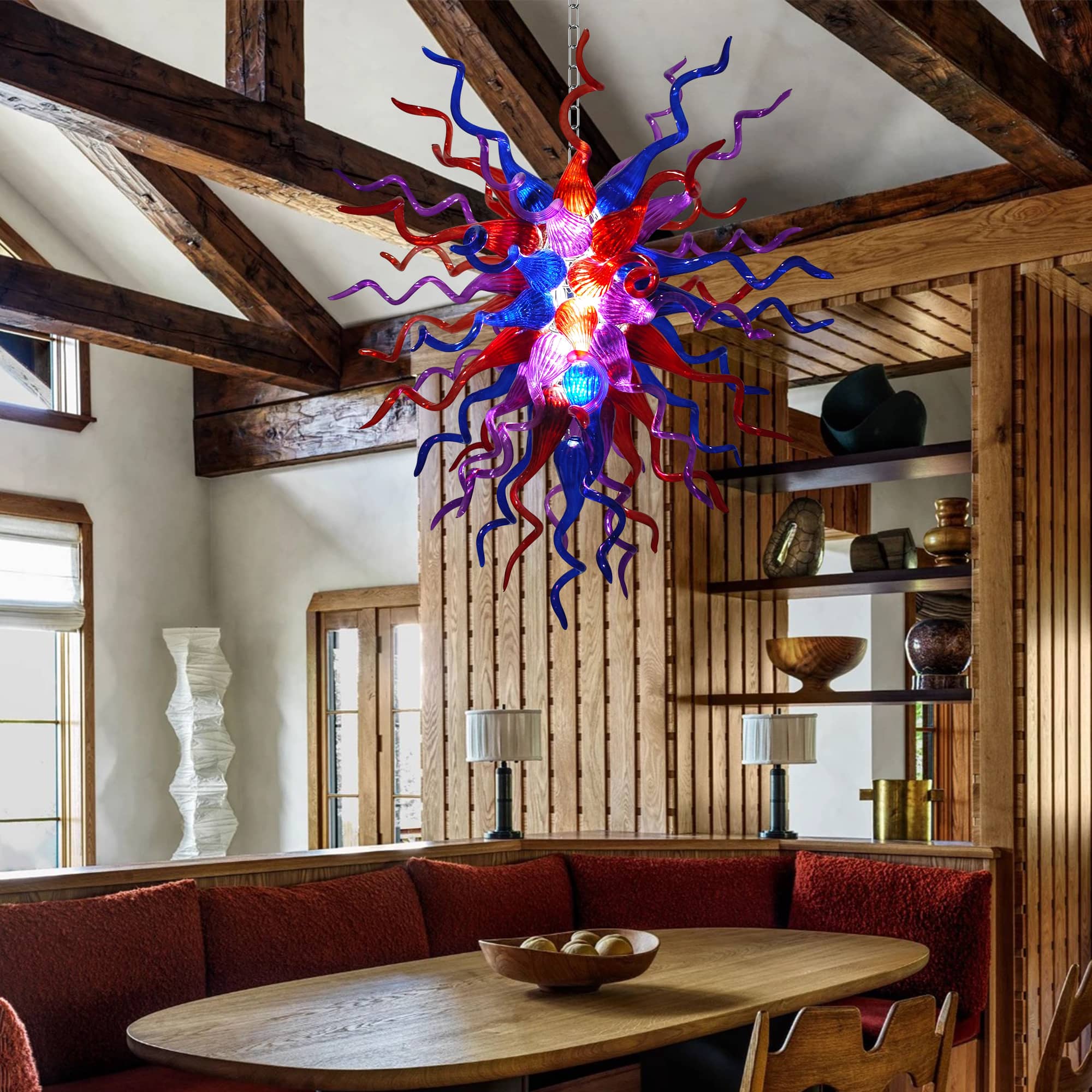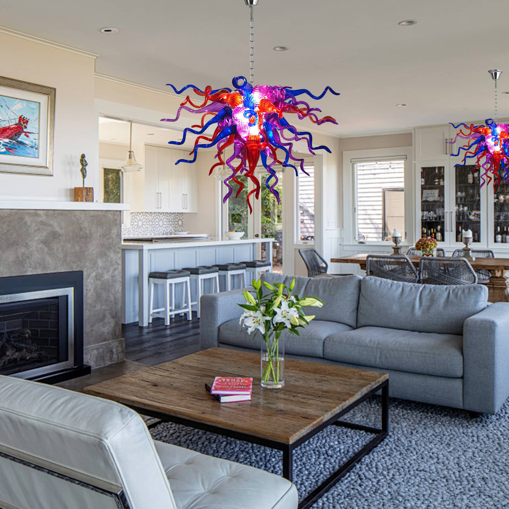 Perfect for grand living rooms, statement dining areas, double-height ceilings, stairwells, or luxury interiors, this Chihuly-inspired glass chandelier is more than a lighting fixture—it is a conversation piece and a work of art. Each piece is truly one of a kind, making your space uniquely yours.