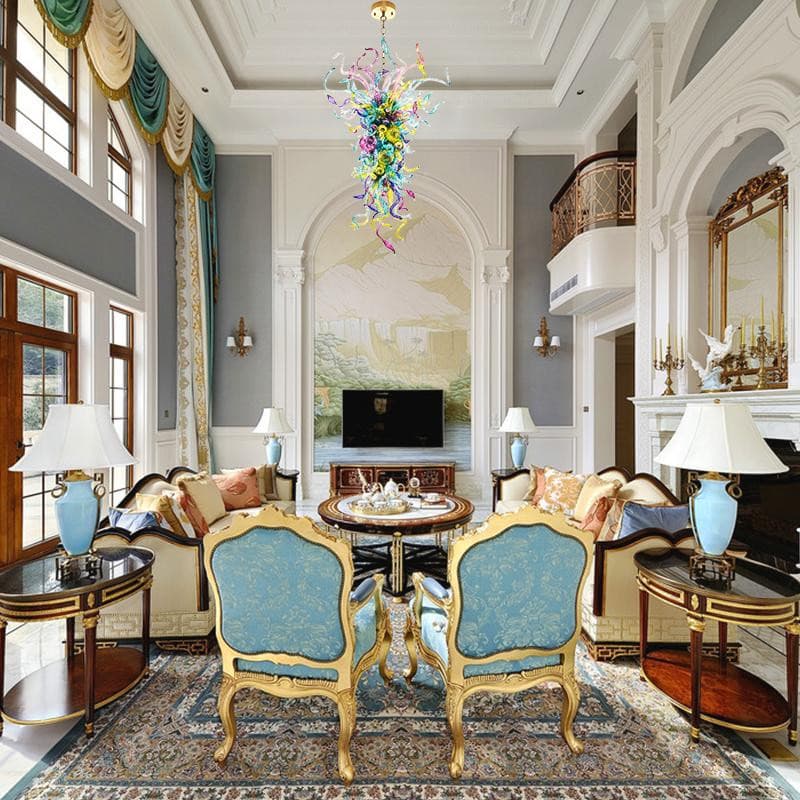 Elevate your space with this stunning multiple colors blown glass chandelier, a breathtaking fusion of color, craftsmanship, and contemporary design. Inspired by the iconic Chihuly-style glass art, this statement lighting piece features a mesmerizing array of twisted tendrils, coiled spirals, and textured Murano glass spheres, all handcrafted with meticulous attention to detail. Ideal for luxury homes, grand foyers, hotels, art galleries, upscale restaurants, and event spaces.