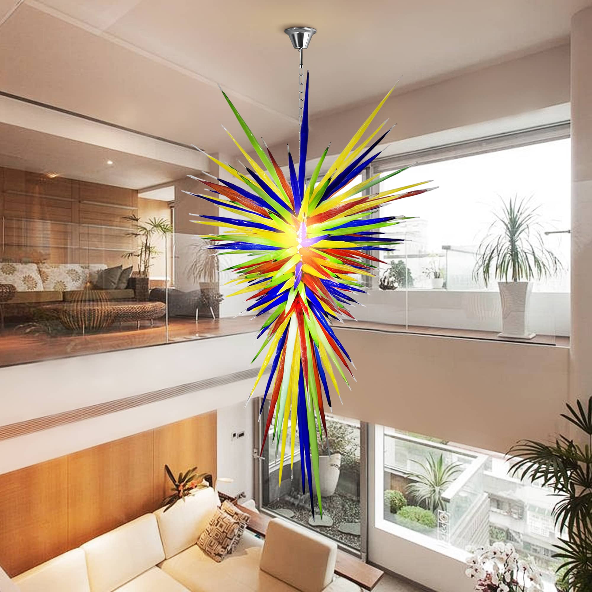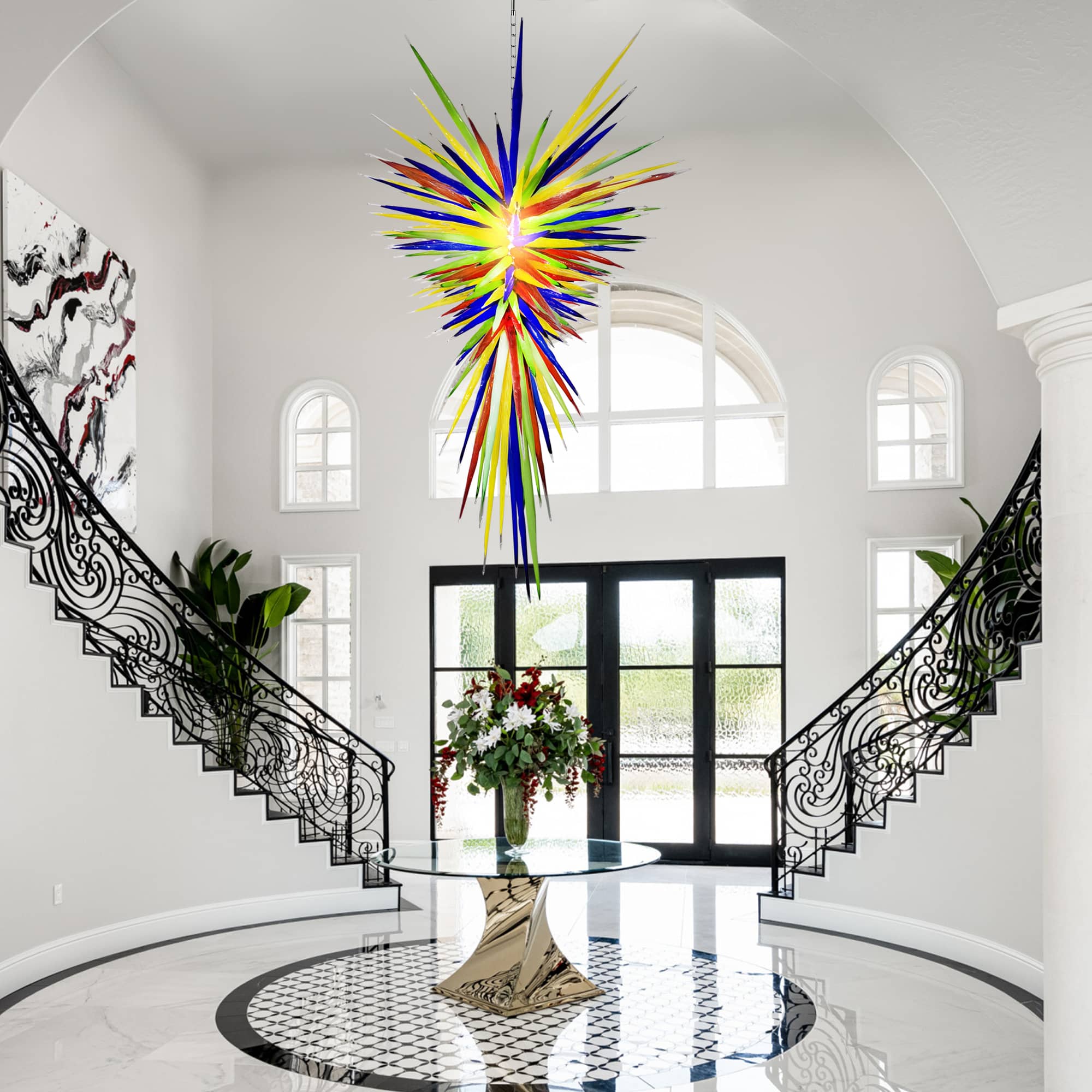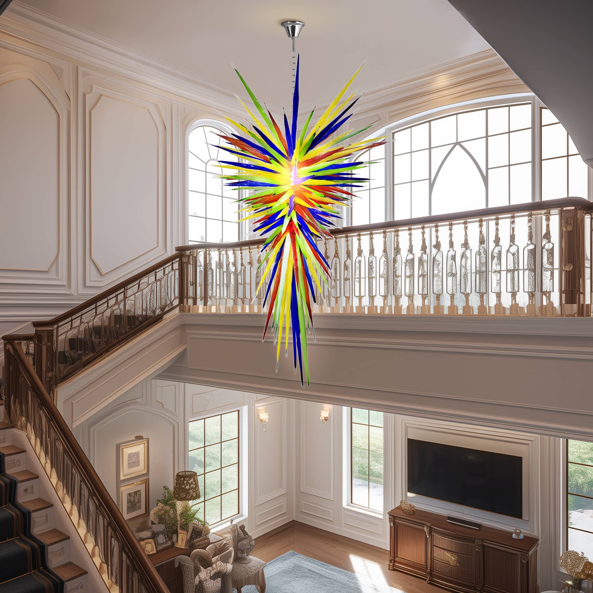 This striking colorful Icicle Chandelier showcases bold, modern glass spikes arranged in a symmetrical design that instantly draws attention. Featuring vibrant multicolored shades (customizable) with clear, tapered ends, it creates a captivating visual effect. With impressive dimensions of D40" x H96", this chandelier is perfect for large spaces or any setting where you want to make a bold statement.