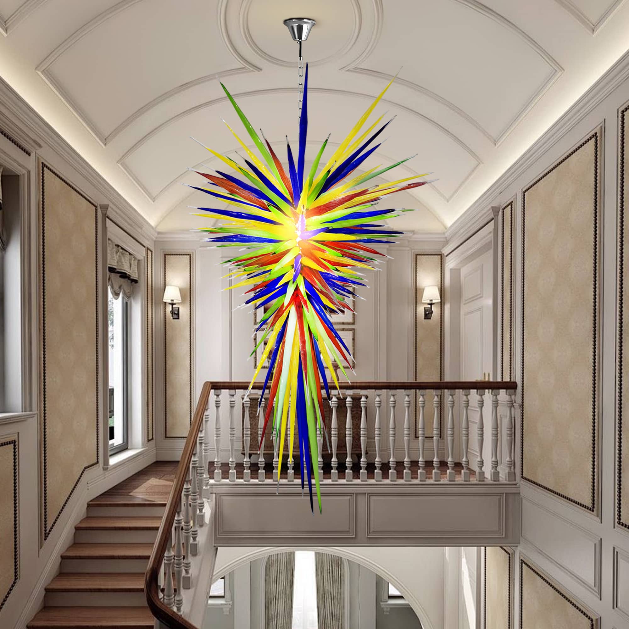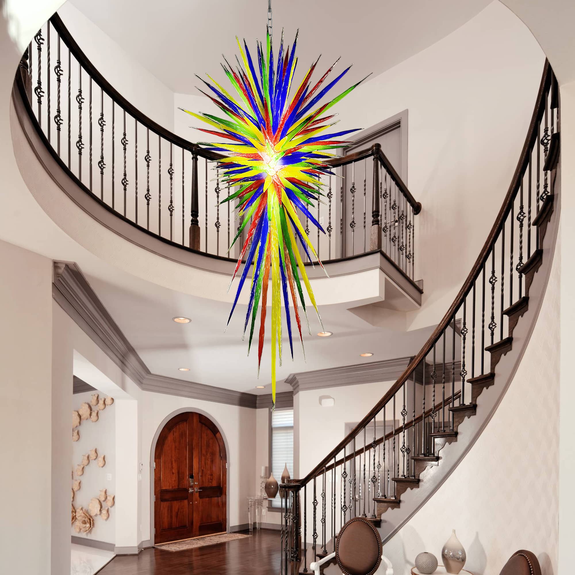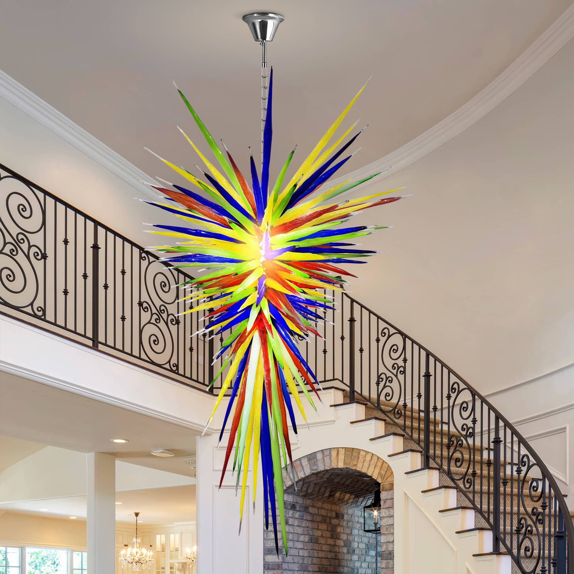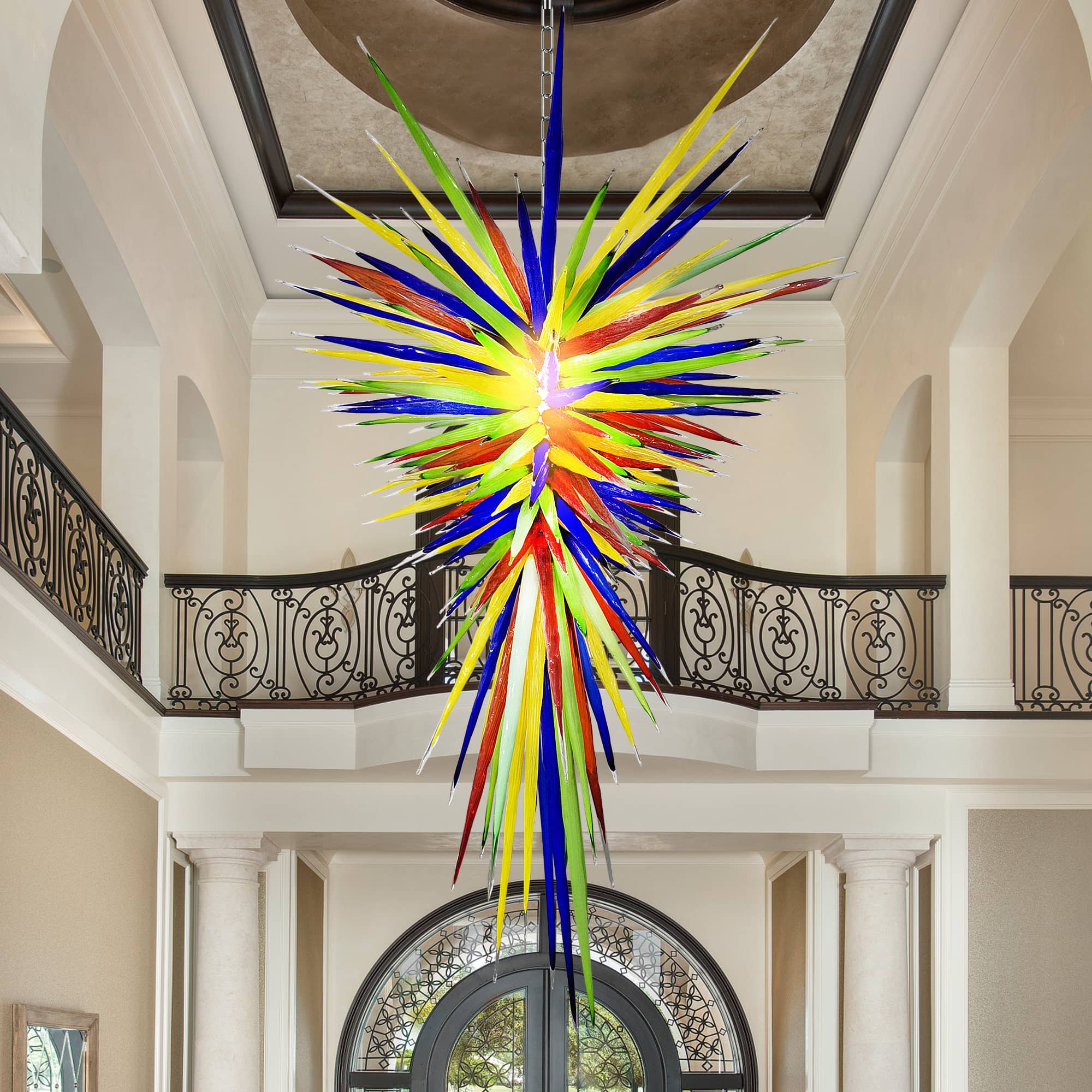 This striking colorful Icicle Chandelier showcases bold, modern glass spikes arranged in a symmetrical design that instantly draws attention. Featuring vibrant multicolored shades (customizable) with clear, tapered ends, it creates a captivating visual effect. With impressive dimensions of D40" x H96", this chandelier is perfect for large spaces or any setting where you want to make a bold statement.