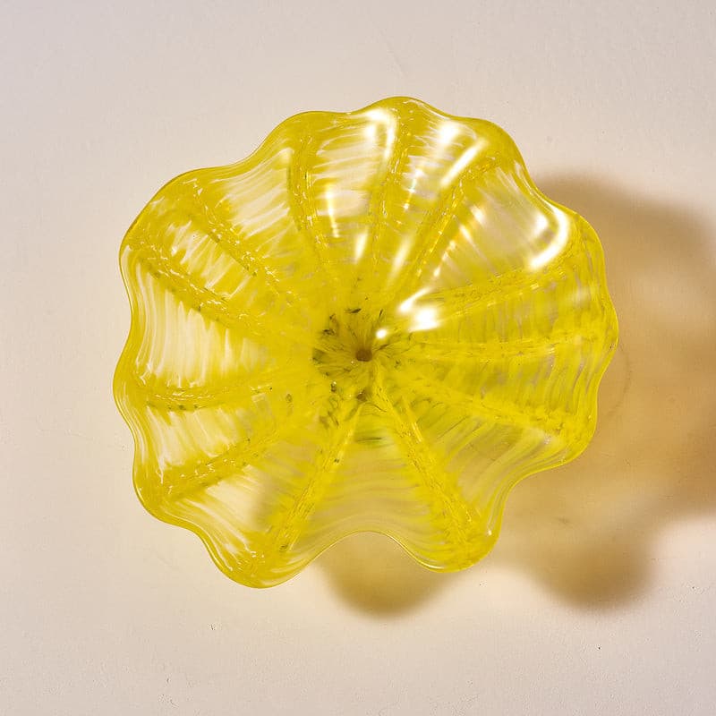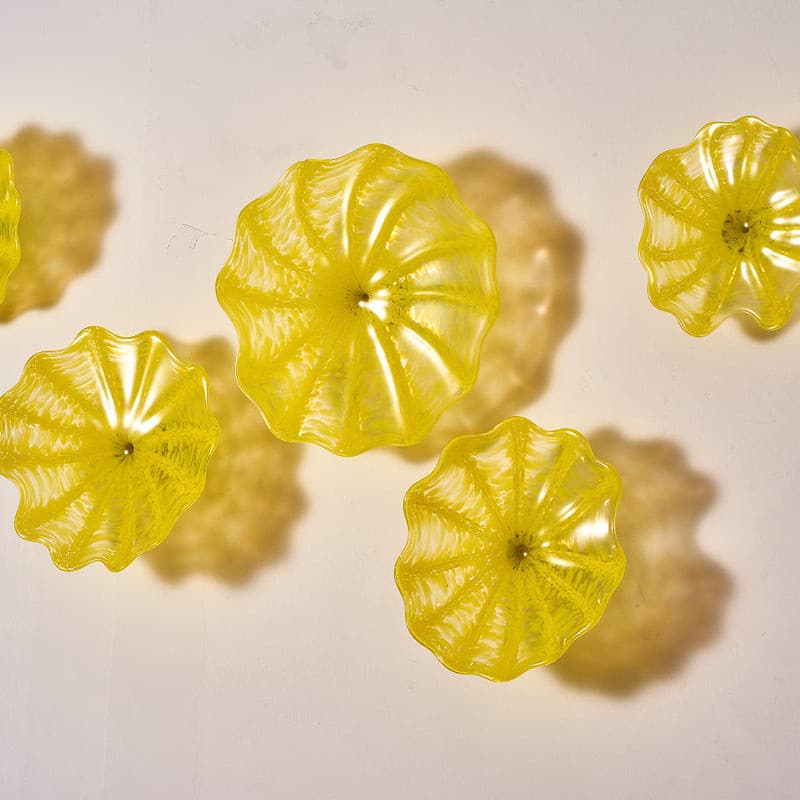 This blown glass wall plates set arrangement will look stunning in all environments with delightfully scalloped edges in crystal yellow swirls of each piece. These Flowers hang individually and can be arranged however you wish to bring your joy beautiful garden indoor.