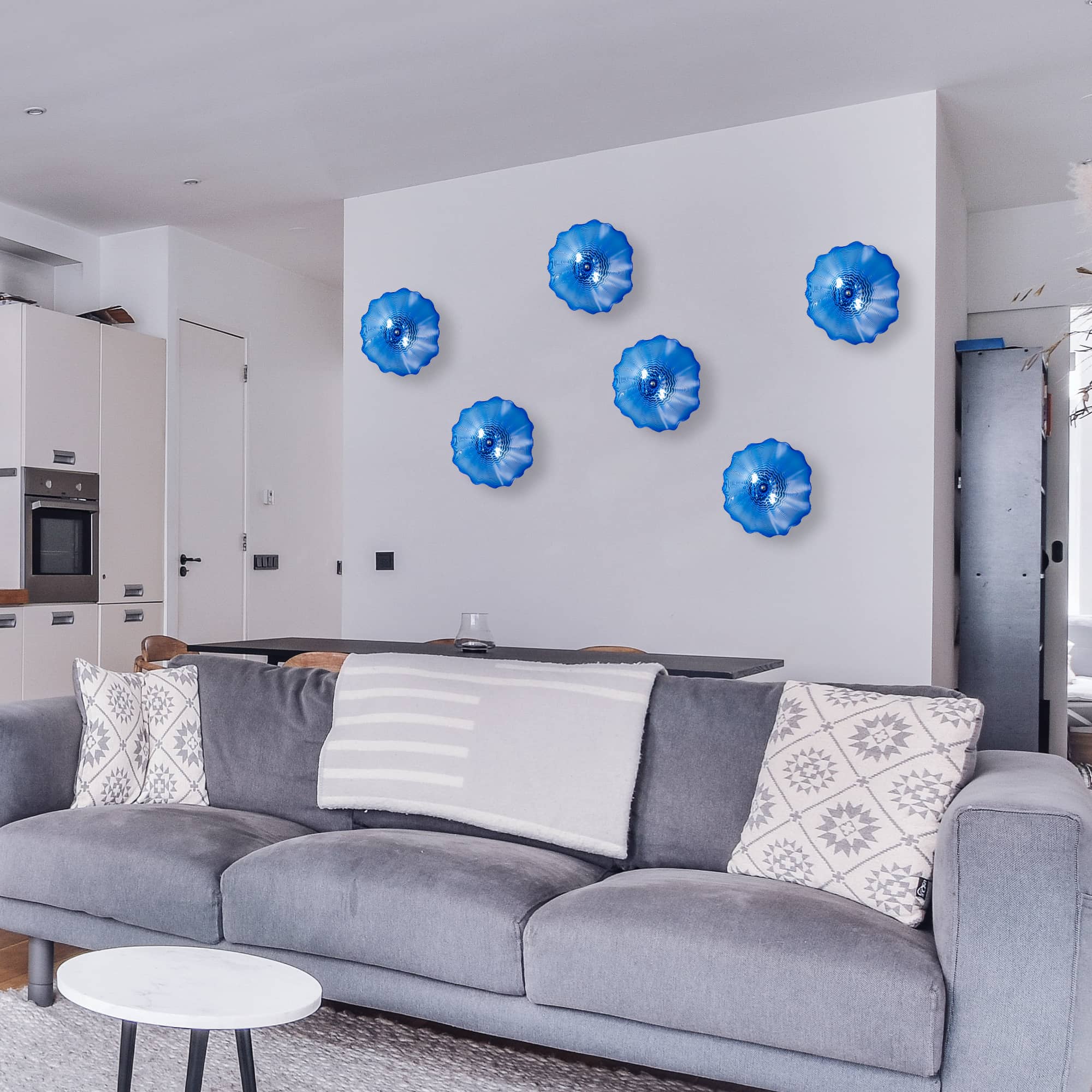 This captivating hand-blown wall art piece showcases classic Murano craftsmanship, featuring cobalt glass disc flower, effortlessly drawing the viewer's attention. The wall mount behind the glass includes two G9 bulbs, allowing viewers to fully appreciate the whimsical charm of the glasswork. The light shining through the swirling lines of the glass adds an extra layer of depth, especially when arranged alongside other wall art pieces.