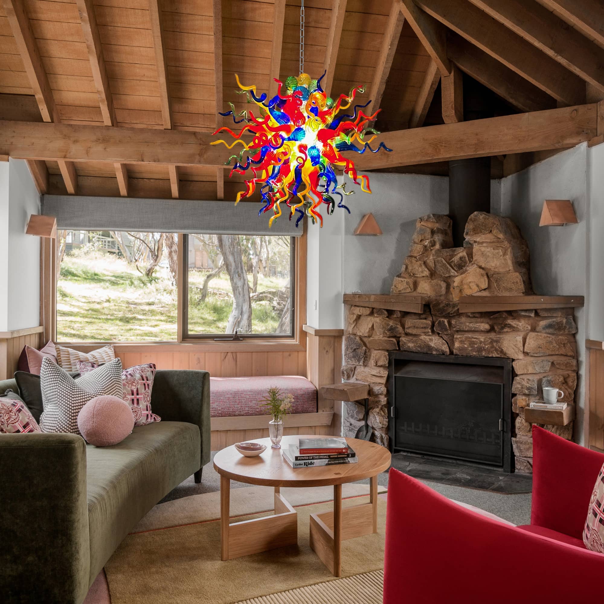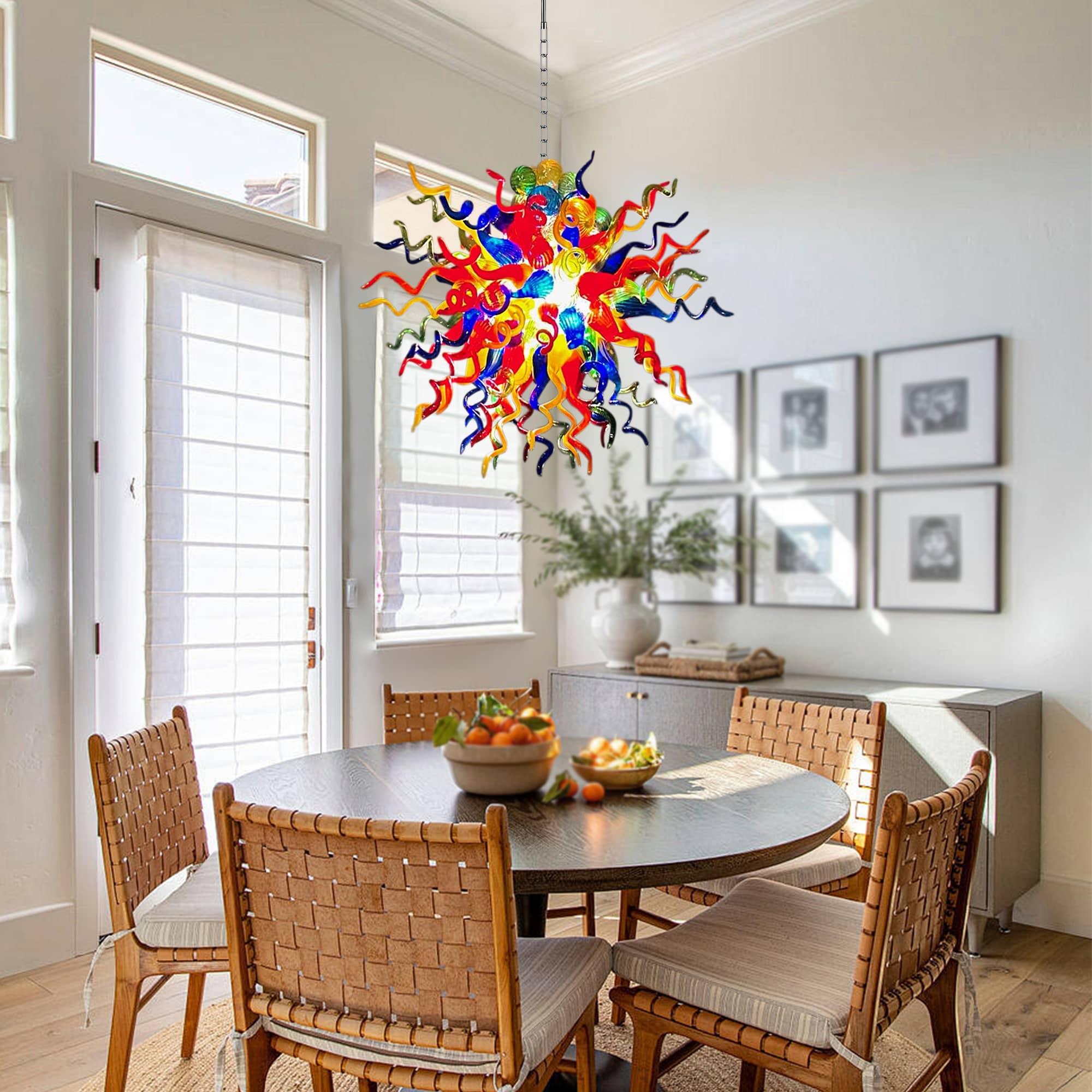 Step into a world of radiant imagination with this Colorburst hand blown glass Chihuly style chandelier. Hand-Blown Glass Chandelier, inspired by the legendary style of Chihuly. This striking lighting sculpture explodes with vibrant energy, featuring a swirling fusion of red, blue, yellow, green, and orange glass arms — each one uniquely hand-crafted by skilled artisans.