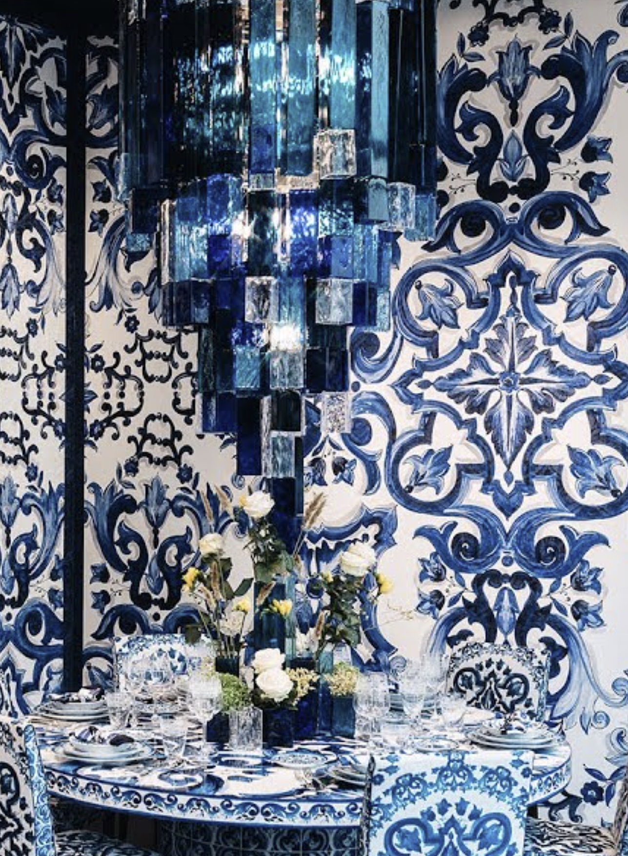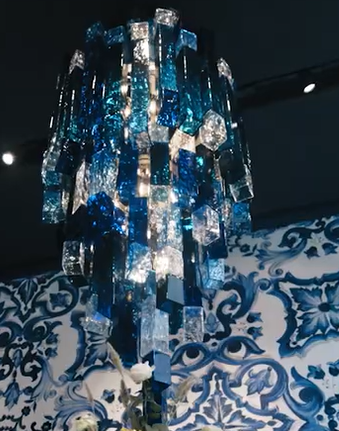 The chandelier showcases a harmonious gradient of Mediterranean blue tones, echoing the serene elegance of the Dolce & Gabbana Blu Mediterraneo interior style. Suspended vertically from a refined metal frame in chrome or brass, the glass tubes are arranged in multiple tiers, creating a dramatic cascading silhouette.
